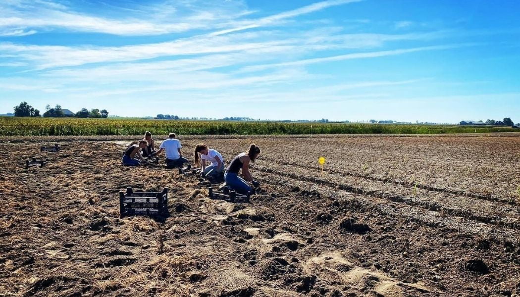 We beginnen vaak rond 07:30 / 08:00 uur en werken dan de hele ochtend en middag door. Je zit op knieën in het land en “rooit” het stammetje handmatig en legt deze in een kistje. Het mooie is dat dit vaak aan het einde van de zomervakantie moet gebeuren en dan zijn er altijd enthousiaste scholieren die dit willen doen om nog even wat bij te verdienen. We gaan vaak met een hele groep tegelijktijdig het land in, om met de hand, de stammetjes te rooien. Dus naast het belangrijke werk wat je doet is het ook nog eens heel gezellig!